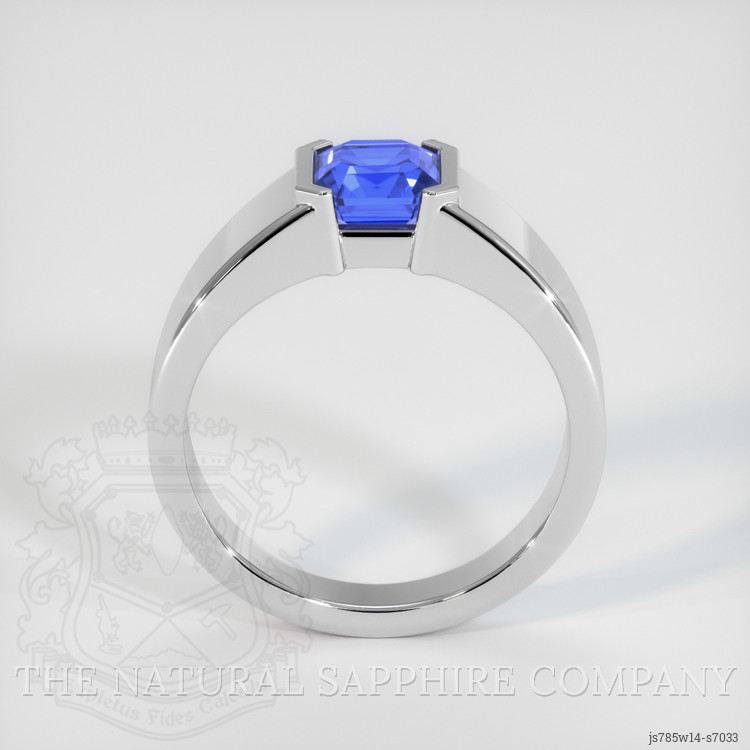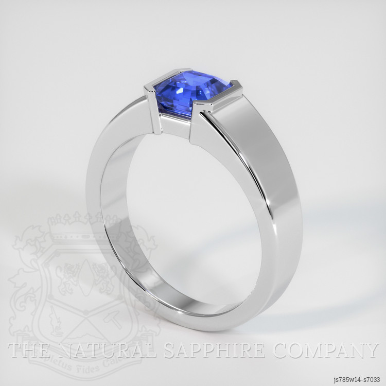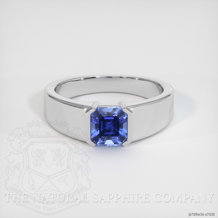 The men's ring features a beautiful, transparent 2.19 carat asscher - octagon shape blue sapphire with the dimensions of 6.86 x 6.85 x 5.25 mm and a asscher cut. It has a clarity grade of eye clean (evaluated at eye level), intense color saturation, and an excellent polish. The origin of this sapphire is Ceylon (Sri Lanka).