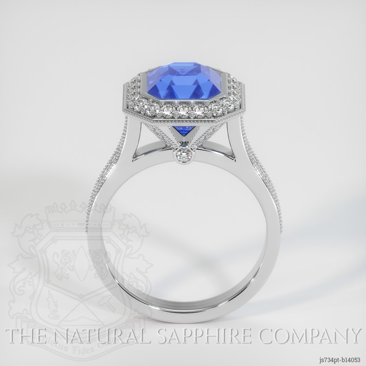 The ring features a beautiful, transparent GIA certified Blue 3.59 carat asscher - octagon shape blue sapphire with the dimensions of 7.85 x 7.24 x 6.59 mm and a asscher cut. It has a clarity grade of very slightly included (evaluated at eye level), medium color saturation, and an excellent polish. The origin of this sapphire is Ceylon (Sri Lanka).