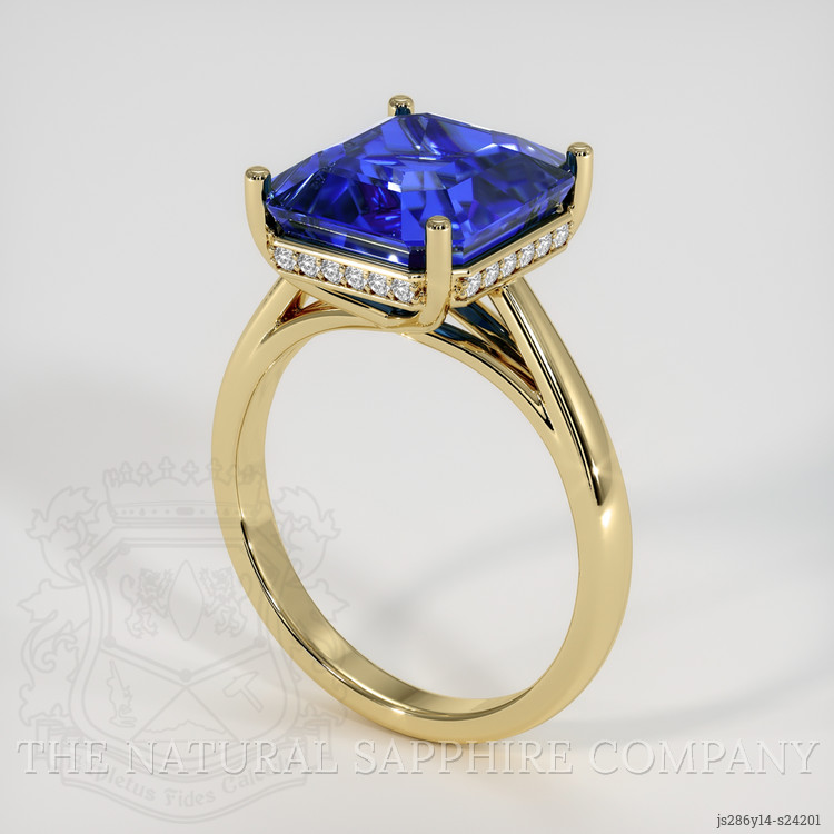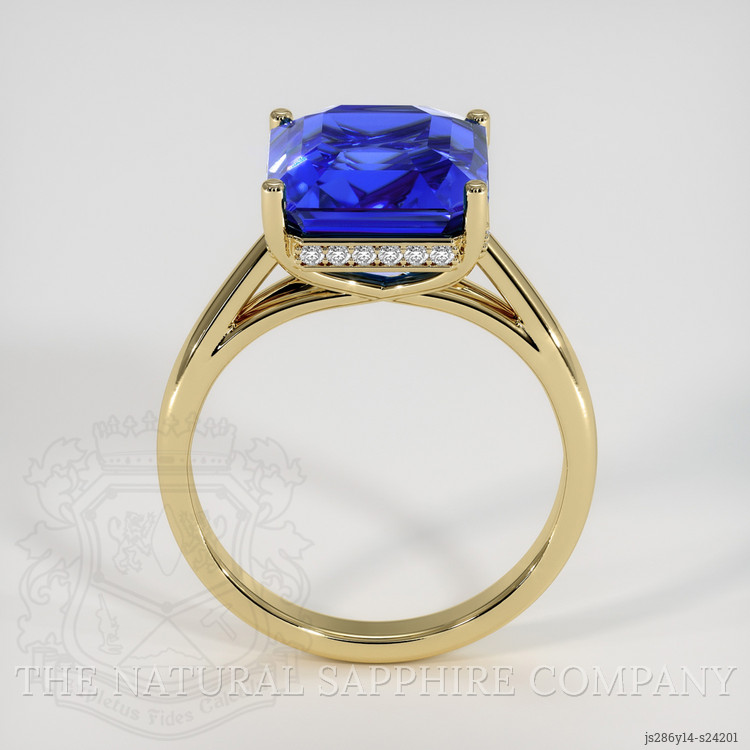 Accompanying the sapphire are white round natural diamonds, weighing approximately 0.105 carats. These diamonds, with a clarity of VS and a color grade of F/G, further enhance the ring, adding a subtle brilliance that elegantly complements the sapphire's majestic presence. Set in a luminous band of 18K yellow gold, the ring's design embraces a sophisticated simplicity that pays homage to traditional gem artistry. The Asscher cut, known for its heritage and grace, is perfectly suited to enhancing the gemstone's reflective properties, allowing it to shimmer under any lighting.