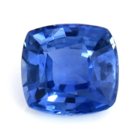 The ring features a beautiful, transparent 0.41 carat cushion shape blue sapphire with the dimensions of 4.49 x 4.24 x 2.42 mm and a mixed brilliant cut. It has a clarity grade of eye clean (evaluated at eye level), intense color saturation, and an excellent polish. The origin of this sapphire is Ceylon (Sri Lanka).