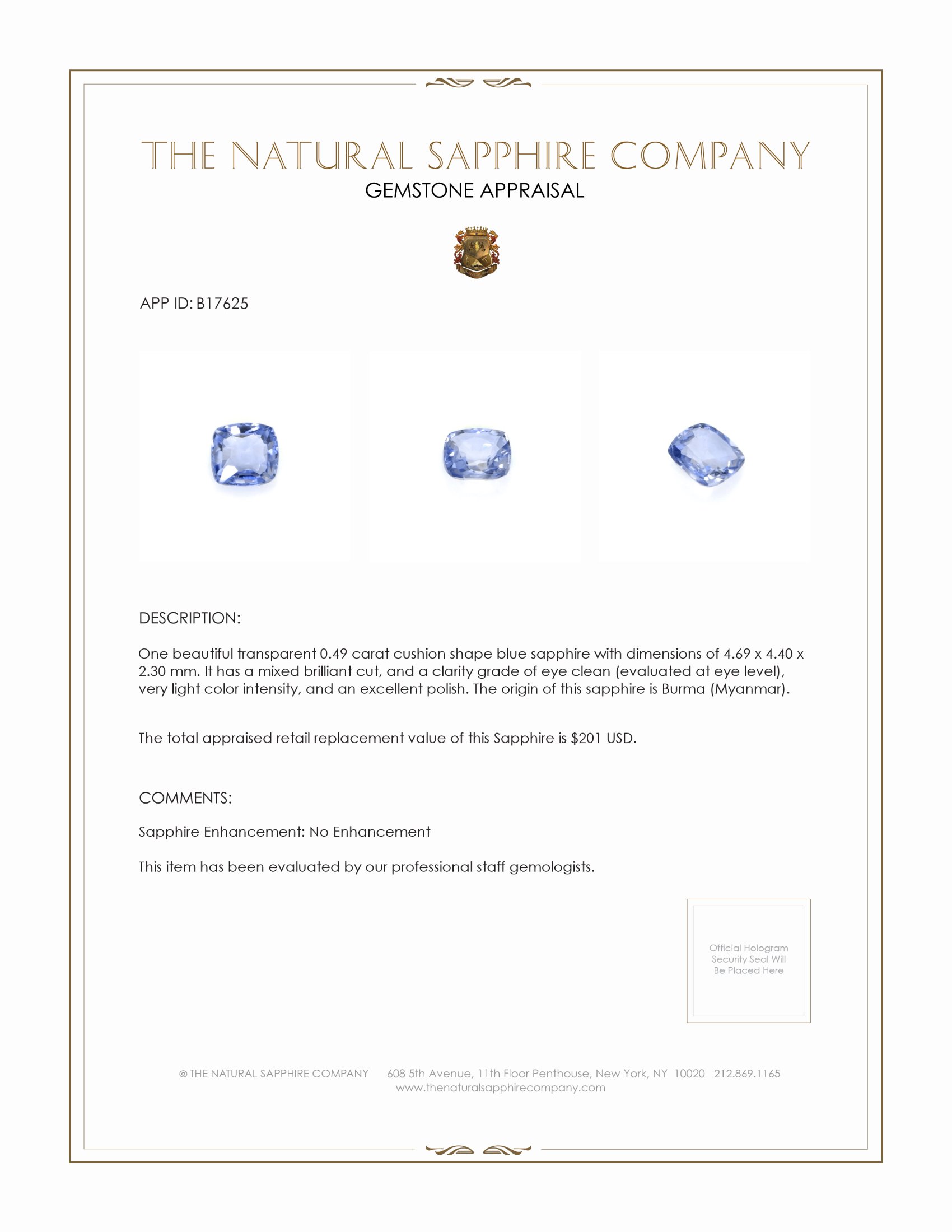 The ring features a beautiful, transparent 0.49 carat cushion shape blue sapphire with the dimensions of 4.69 x 4.40 x 2.30 mm and a mixed brilliant cut. It has a clarity grade of eye clean (evaluated at eye level), very light color saturation, and an excellent polish. The origin of this sapphire is Burma (Myanmar).