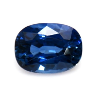 The ring features a beautiful, transparent 0.64 carat cushion shape blue sapphire with the dimensions of 5.75 x 4.31 x 3.03 mm and a mixed brilliant cut. It has a clarity grade of very slightly included (evaluated at eye level), vivid color saturation, and an excellent polish. The origin of this sapphire is Ceylon (Sri Lanka).