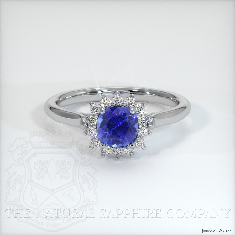 The ring features a beautiful, transparent 0.67 carat cushion shape blue sapphire with the dimensions of 5.09 x 5.04 x 3.35 mm and a mixed brilliant cut. It has a clarity grade of very slightly included (evaluated at eye level), intense color saturation, and an excellent polish. The origin of this sapphire is Ceylon (Sri Lanka).