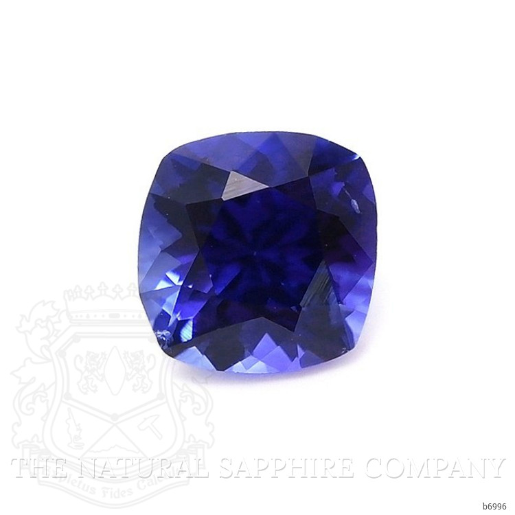 The ring features a beautiful, transparent 0.68 carat cushion shape blue sapphire with the dimensions of 4.99 x 4.94 x 3.43 mm and a mixed brilliant cut. It has a clarity grade of very slightly included (evaluated at eye level), vivid color saturation, and an excellent polish. The origin of this sapphire is Ceylon (Sri Lanka).