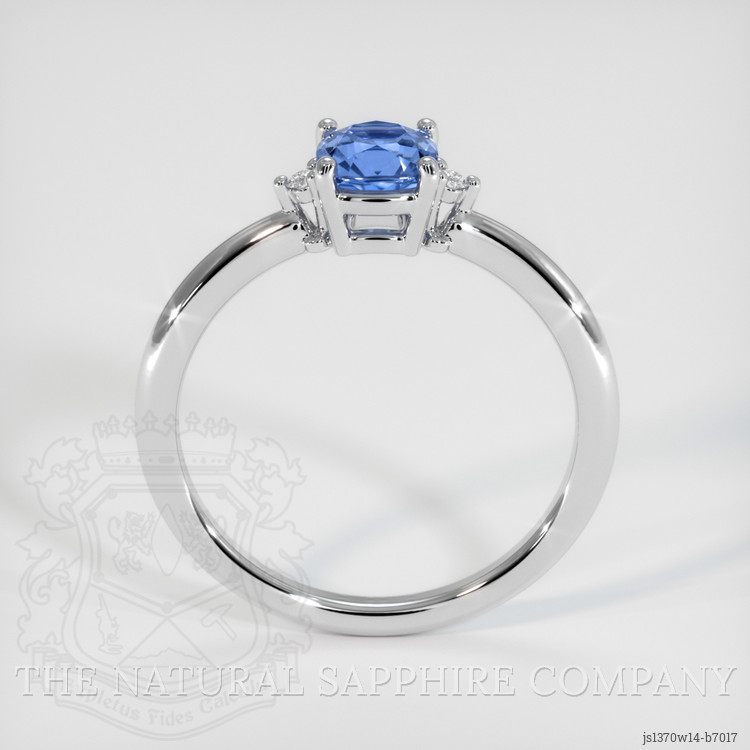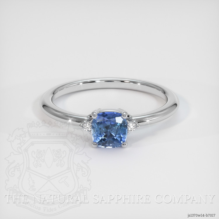 The ring features a beautiful, transparent 0.71 carat cushion shape blue sapphire with the dimensions of 5.01 x 5.00 x 3.47 mm and a mixed brilliant cut. It has a clarity grade of slightly included (evaluated at eye level), medium color saturation, and an excellent polish. Enhancement: heat treated. The origin of this sapphire is Ceylon (Sri Lanka).