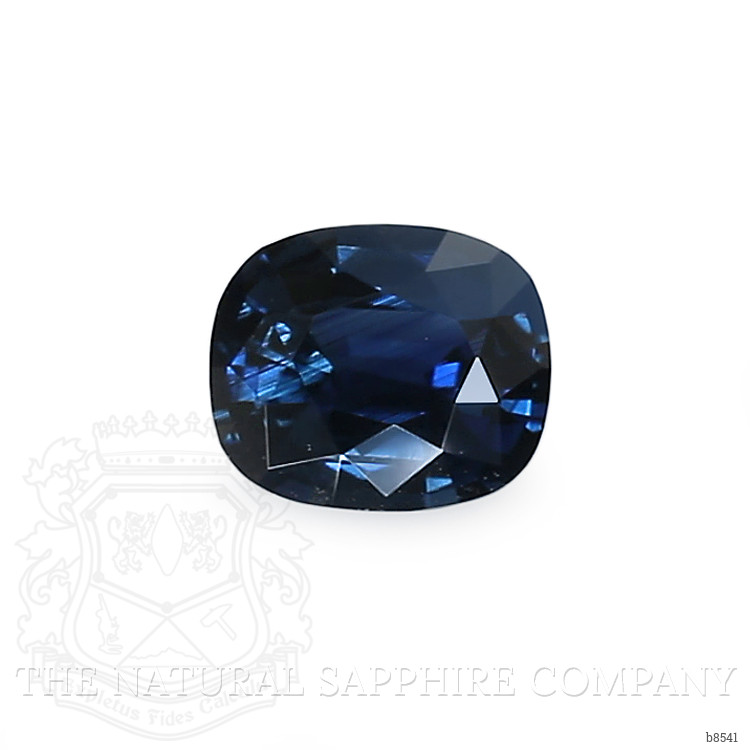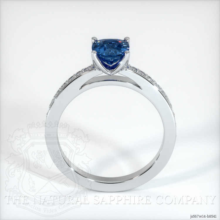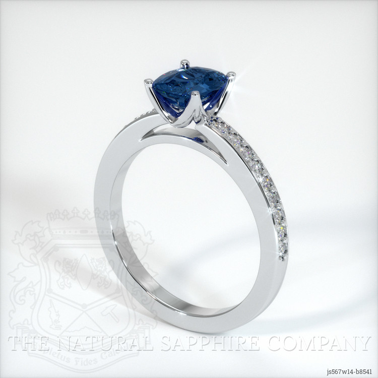 The ring features a beautiful, transparent 0.95 carat cushion shape blue sapphire with the dimensions of 6.49 x 5.47 x 3.07 mm and a mixed brilliant cut. It has a clarity grade of very slightly included (evaluated at eye level), dark color saturation, and an excellent polish. The origin of this sapphire is Ceylon (Sri Lanka).