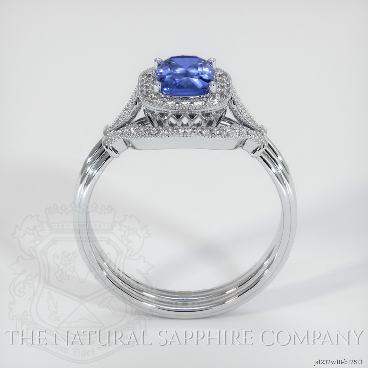 The ring features a beautiful, transparent 1.00 carat cushion shape blue sapphire with the dimensions of 6.82 x 4.91 x 3.24 mm and a mixed brilliant cut. It has a clarity grade of eye clean (evaluated at eye level), medium intense color saturation, and an excellent polish. The origin of this sapphire is Ceylon (Sri Lanka).