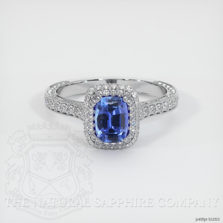The ring features a beautiful, transparent 1.00 carat cushion shape blue sapphire with the dimensions of 6.82 x 4.91 x 3.24 mm and a mixed brilliant cut. It has a clarity grade of eye clean (evaluated at eye level), medium intense color saturation, and an excellent polish. The origin of this sapphire is Ceylon (Sri Lanka).