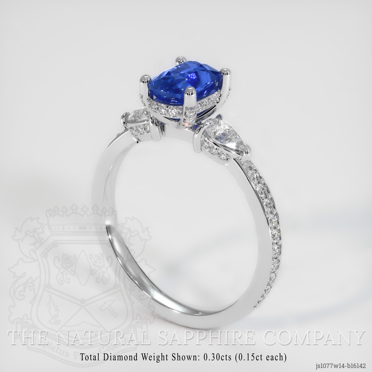 Featured in the ring: White pear shaped diamonds, weighing approx 0.30 carats, clarity VS1/VS2 and a color grade of E.