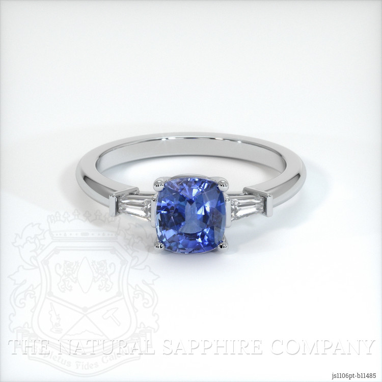 The ring features a beautiful, transparent 1.20 carat cushion shape blue sapphire with the dimensions of 6.21 x 5.78 x 3.62 mm and a mixed brilliant cut. It has a clarity grade of very slightly included (evaluated at eye level), intense color saturation, and an excellent polish. The origin of this sapphire is Ceylon(Sri Lanka).