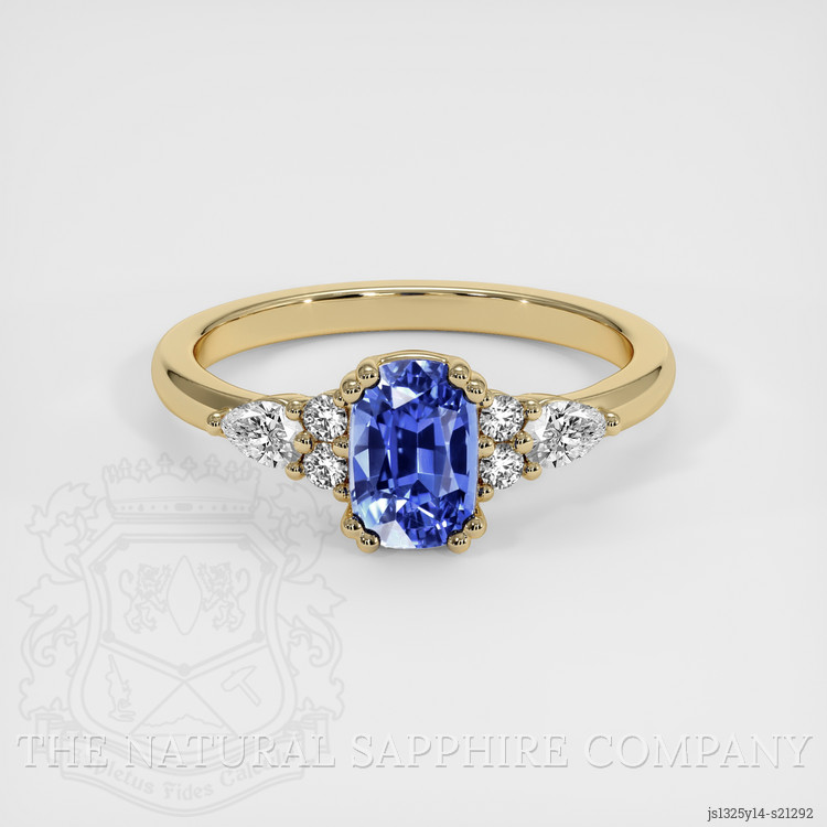 In the gentle embrace of 14K yellow gold, this exquisite ring from The Natural Sapphire Company captures the romance of time itself. At its heart lies a magnificent 1.24-carat blue sapphire, harvested from the serene lands of Ceylon. With dimensions of 7.05 x 4.77 x 3.88 mm, this cushion-shaped gem invites the eye into a world of vivid dreams and deep oceans. Its mixed brilliant cut dances with the light, unveiling an intense color saturation that echoes the profound beauty of twilight skies. Heat treatment has only enhanced its natural allure, maintaining an eye-clean clarity that symbolizes purity and serenity in equal measure.