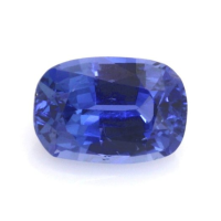 The ring features a beautiful, transparent 1.28 carat cushion shape blue sapphire with the dimensions of 7.38 x 5.13 x 3.54 mm and a mixed brilliant cut. It has a clarity grade of very slightly included (evaluated at eye level), vivid color saturation, and an excellent polish. The origin of this sapphire is Ceylon (Sri Lanka).