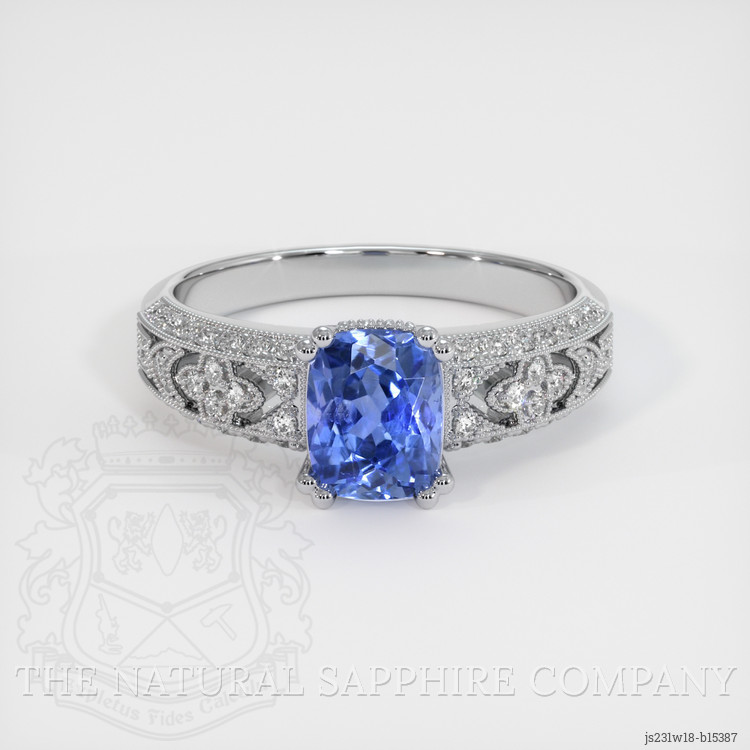 The ring features a beautiful, transparent 1.35 carat cushion shape blue sapphire with the dimensions of 6.74 x 5.44 x 3.98 mm and a mixed brilliant cut. It has a clarity grade of very slightly included (evaluated at eye level), medium intense color saturation, and an excellent polish. The origin of this sapphire is Ceylon (Sri Lanka).