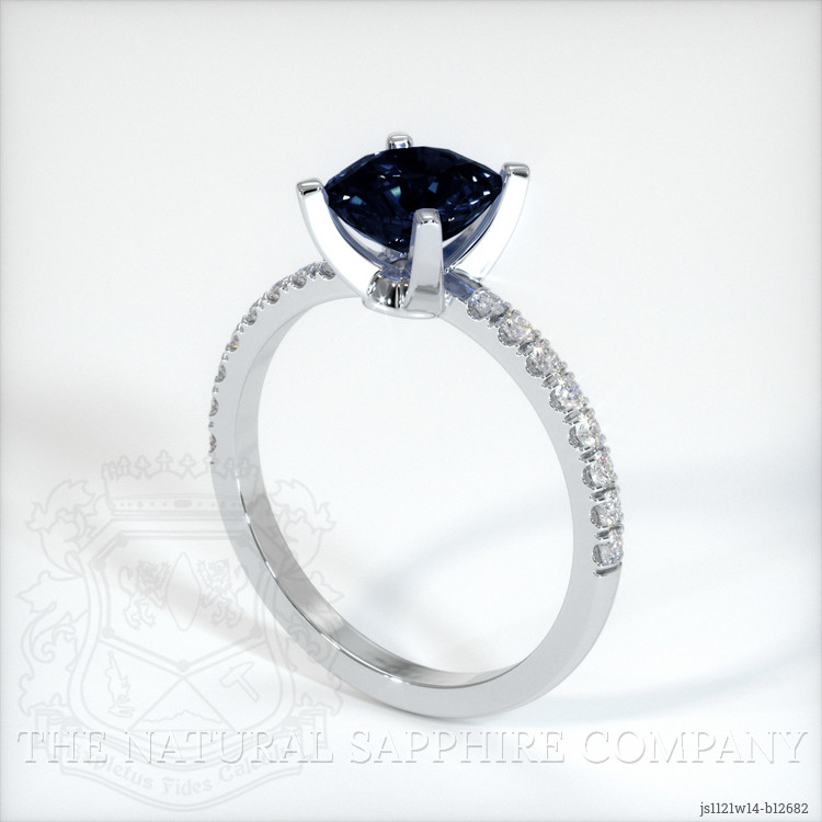 The ring features a beautiful, transparent 1.52 carat cushion shape blue sapphire with the dimensions of 6.47 x 6.39 x 4.00 mm and a mixed brilliant cut. It has a clarity grade of eye clean (evaluated at eye level), dark color saturation, and an excellent polish. The origin of this sapphire is Thailand.