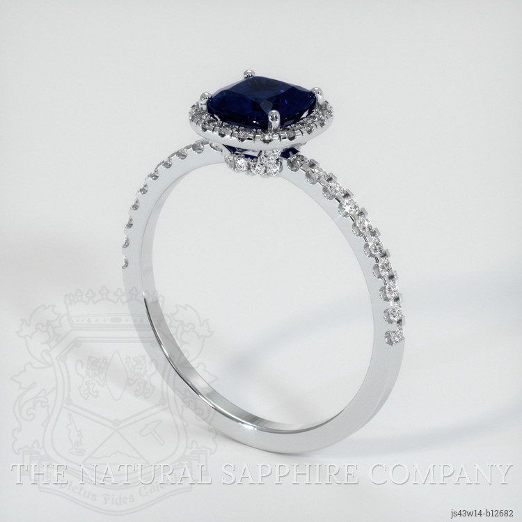 The ring features a beautiful, transparent 1.52 carat cushion shape blue sapphire with the dimensions of 6.47 x 6.39 x 4.00 mm and a mixed brilliant cut. It has a clarity grade of eye clean (evaluated at eye level), dark color saturation, and an excellent polish. The origin of this sapphire is Thailand.