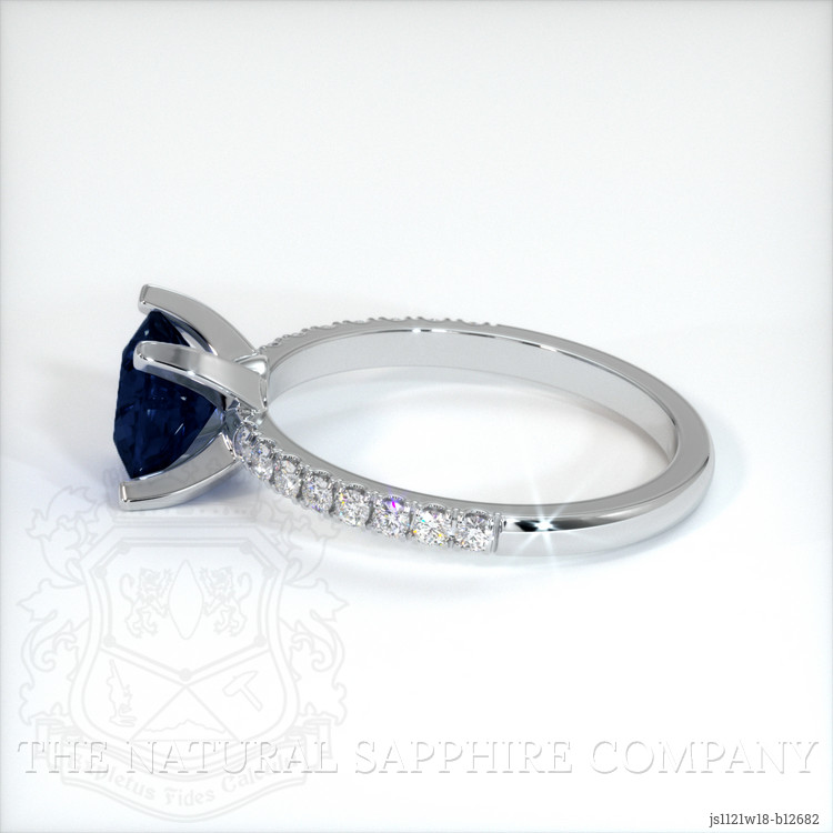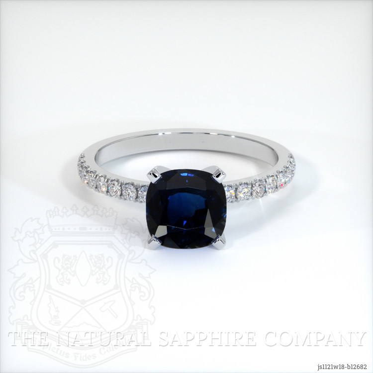 The ring features a beautiful, transparent 1.52 carat cushion shape blue sapphire with the dimensions of 6.47 x 6.39 x 4.00 mm and a mixed brilliant cut. It has a clarity grade of eye clean (evaluated at eye level), dark color saturation, and an excellent polish. The origin of this sapphire is Thailand.