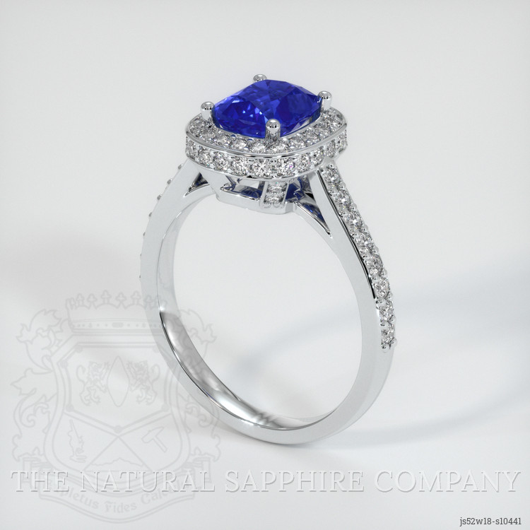 The ring features a beautiful, transparent 1.53 carat cushion shape blue sapphire with the dimensions of 6.70 x 5.85 x 4.21 mm and a mixed brilliant cut. It has a clarity grade of very slightly included (evaluated at eye level), vivid color saturation, and an excellent polish. The origin of this sapphire is Ceylon (Sri Lanka).