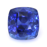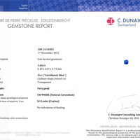 The ring features a beautiful, transparent C.Dunaigre certified Vivid Blue “Cornflower Blue” 1.64 carat cushion shape blue sapphire with the dimensions of 6.29 x 6.07 x 4.76 mm and a mixed brilliant cut. It has a clarity grade of very slightly included (evaluated at eye level), vivid color saturation, and an excellent polish. The origin of this sapphire is Ceylon (Sri Lanka).