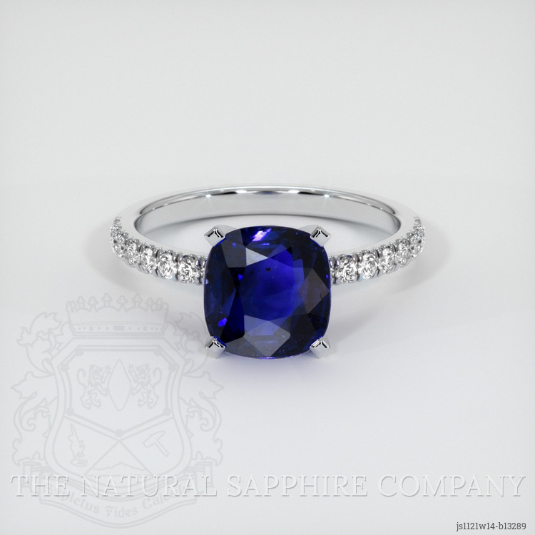 The ring features a beautiful, transparent 2.04 carat cushion shape blue sapphire with the dimensions of 7.43 x 7.10 x 4.07 mm and a mixed brilliant cut. It has a clarity grade of slightly included (evaluated at eye level), dark color saturation, and an excellent polish. The origin of this sapphire is Ceylon (Sri Lanka).