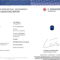 The ring features a beautiful, transparent C.Dunaigre certified Vivid Blue “Royal Blue” 17.17 carat cushion shape blue sapphire with the dimensions of 16.14 x 13.73 x 8.60 mm and a mixed brilliant cut. It has a clarity grade of eye clean (evaluated at eye level), vivid color saturation, and an excellent polish. The origin of this sapphire is Ceylon (Sri Lanka).