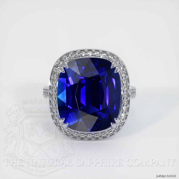The ring features a beautiful, transparent C.Dunaigre certified Vivid Blue “Royal Blue” 17.17 carat cushion shape blue sapphire with the dimensions of 16.14 x 13.73 x 8.60 mm and a mixed brilliant cut. It has a clarity grade of eye clean (evaluated at eye level), vivid color saturation, and an excellent polish. The origin of this sapphire is Ceylon (Sri Lanka).