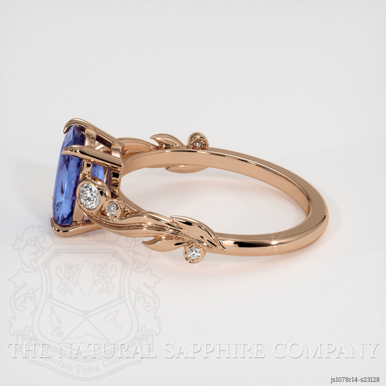 Set in 14K rose gold, the ring epitomizes elegance and sophistication. The warm hue of rose gold provides a delightful contrast, accentuating the azure depth of the sapphire. This harmonious blend of materials and colors ensures that the ring remains timeless in its appeal. The inclusion of white, round-shaped natural diamonds, weighing approximately 0.08 and 0.03 carats respectively, adds an element of understated luxury. These diamonds, with a clarity of VS1 to VS2 and a color grade of F, are carefully selected to complement the central gemstone, further enhancing the overall aesthetic.
