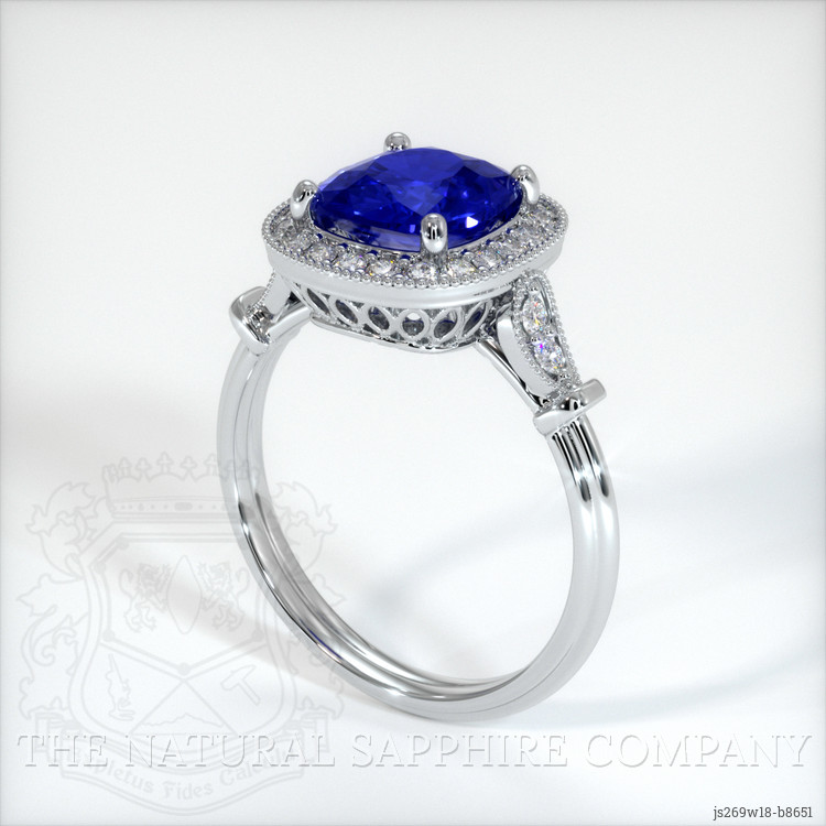 The ring features a beautiful, transparent C.Dunaigre certified Vivid Blue “Royal Blue” 2.00 carat cushion shape blue sapphire with the dimensions of 7.61 x 7.28 x 4.36 mm and a mixed brilliant cut. It has a clarity grade of very slightly included (evaluated at eye level), vivid color saturation, and an excellent polish. The origin of this sapphire is Ceylon (Sri Lanka).
