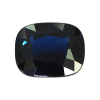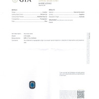 The ring features a beautiful, transparent GIA certified Blue 2.12 carat cushion shape blue sapphire with the dimensions of 8.88 x 7.17 x 3.49 mm and a mixed brilliant cut. It has a clarity grade of very slightly included (evaluated at eye level), dark color saturation, and an excellent polish. The origin of this sapphire is Australia.