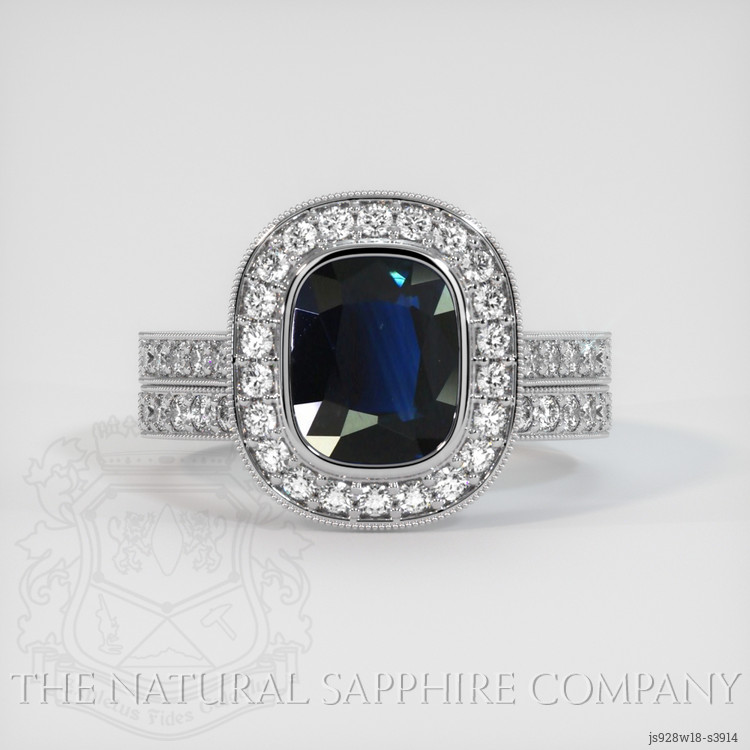 The ring features a beautiful, transparent GIA certified Blue 2.12 carat cushion shape blue sapphire with the dimensions of 8.88 x 7.17 x 3.49 mm and a mixed brilliant cut. It has a clarity grade of very slightly included (evaluated at eye level), dark color saturation, and an excellent polish. The origin of this sapphire is Australia.