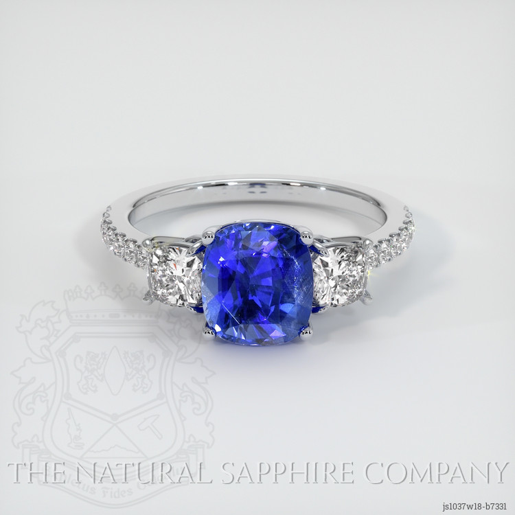 The ring features a beautiful, transparent 2.21 carat cushion shape blue sapphire with the dimensions of 7.63 x 6.87 x 4.90 mm and a mixed brilliant cut. It has a clarity grade of very slightly included (evaluated at eye level), vivid color saturation, and an excellent polish. The origin of this sapphire is Ceylon (Sri Lanka).
