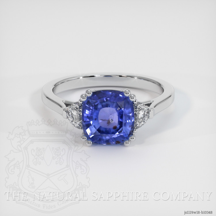 The ring features a beautiful, transparent 2.30 carat cushion shape blue sapphire with the dimensions of 7.68 x 7.44 x 4.45 mm and a mixed brilliant cut. It has a clarity grade of slightly included (evaluated at eye level), intense color saturation, and an excellent polish. The origin of this sapphire is Ceylon (Sri Lanka).