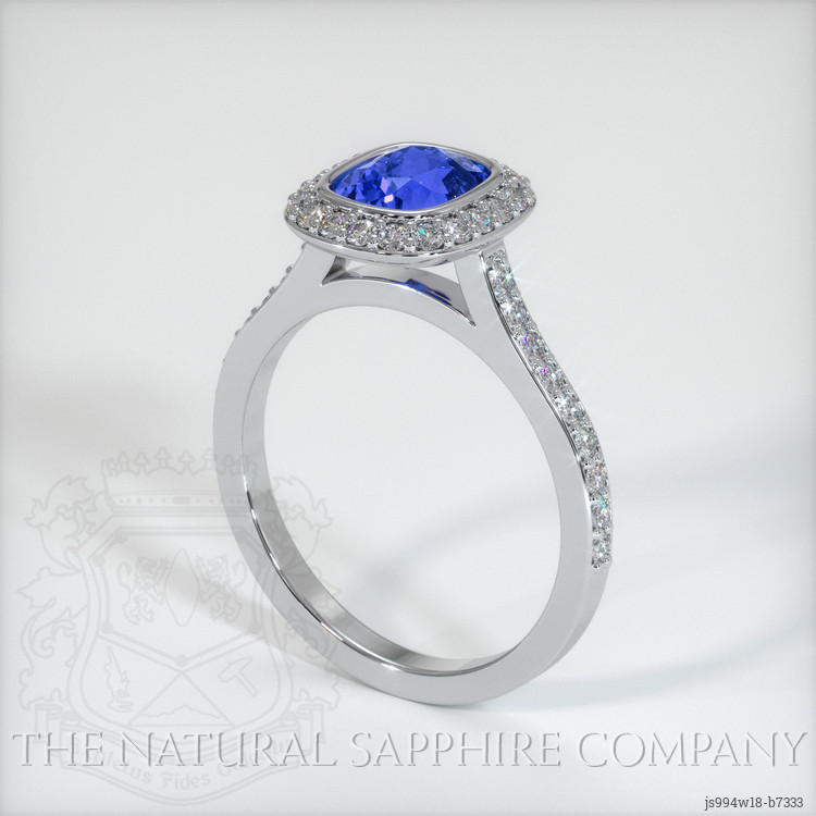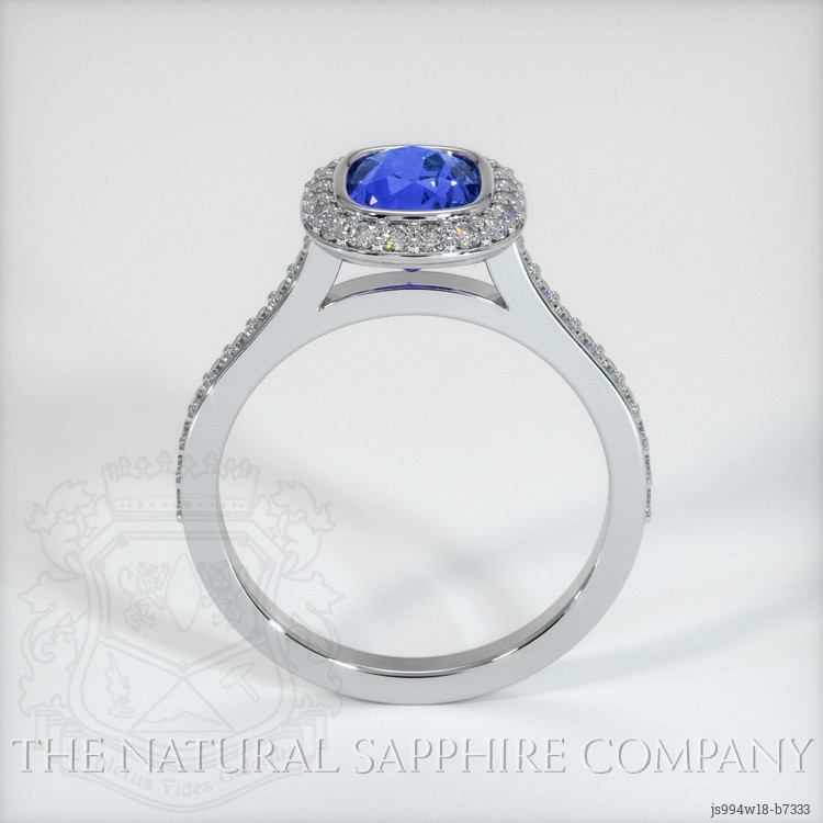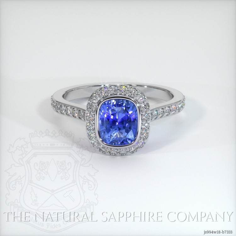 The ring features a beautiful, transparent 2.32 carat cushion shape blue sapphire with the dimensions of 7.59 x 6.10 x 5.49 mm and a mixed brilliant cut. It has a clarity grade of very slightly included (evaluated at eye level), intense color saturation, and an excellent polish. The origin of this sapphire is Ceylon (Sri Lanka).