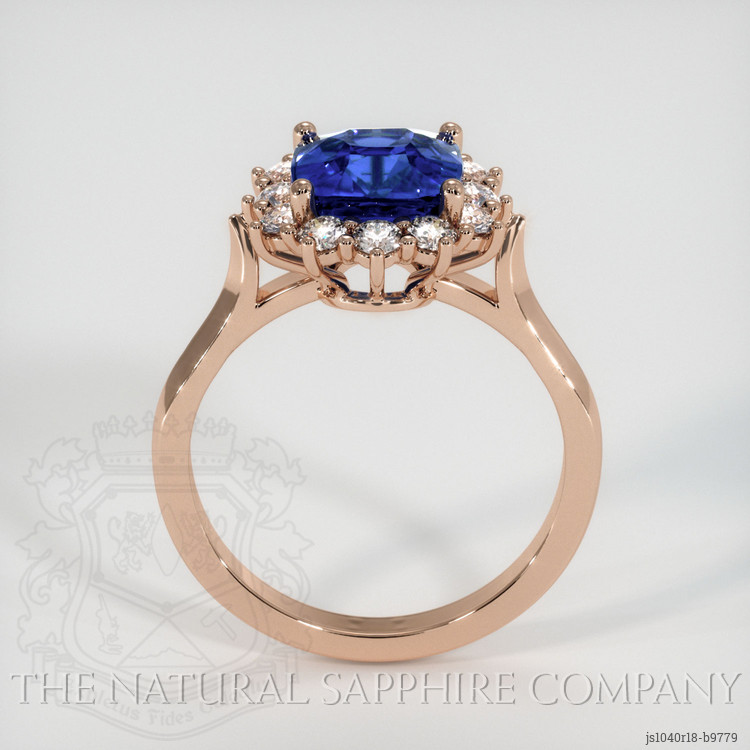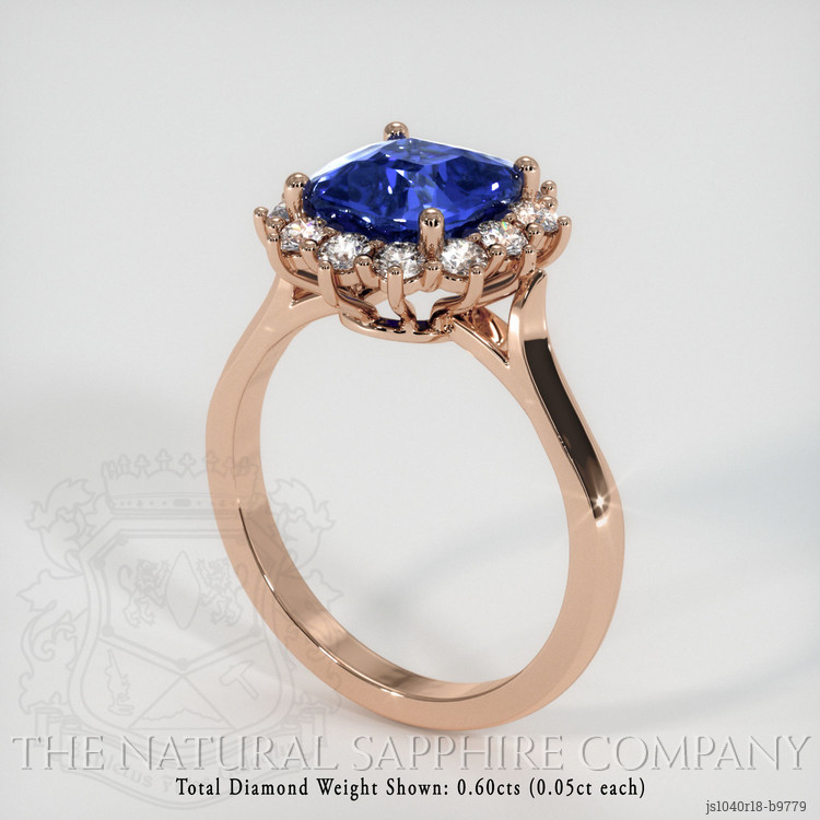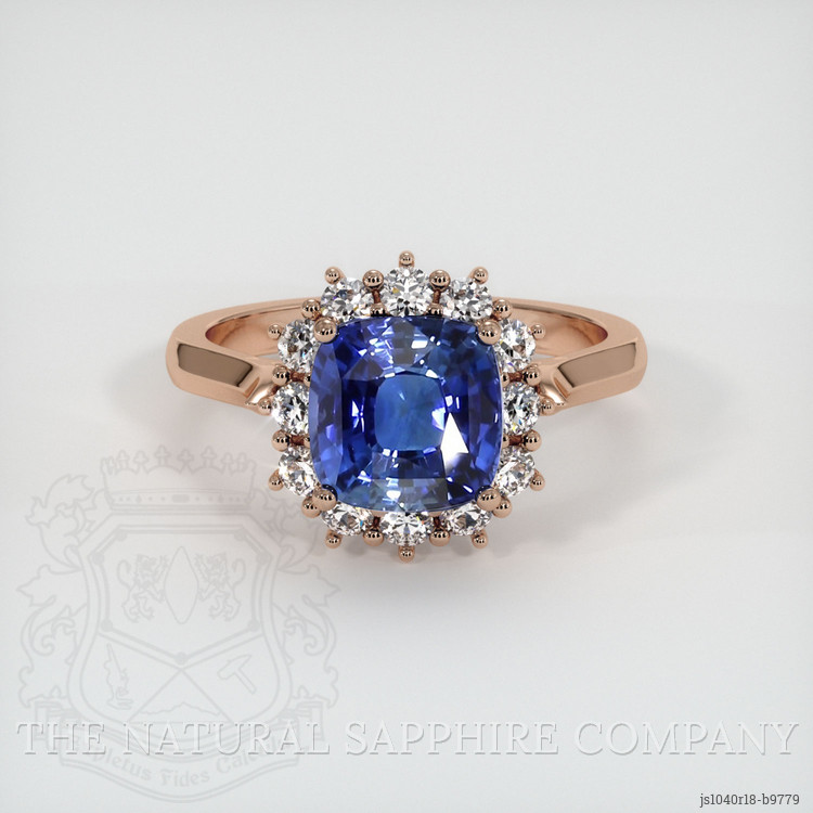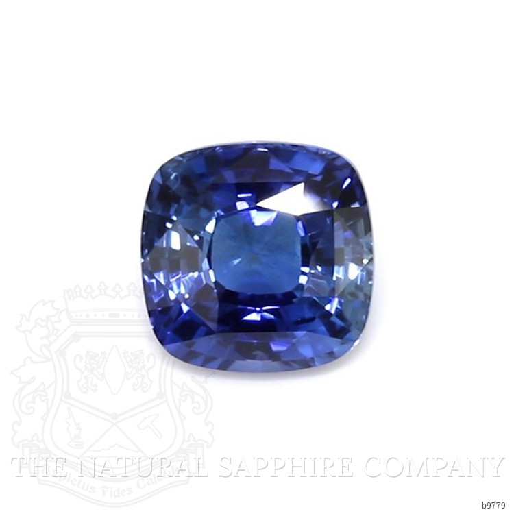 The ring features a beautiful, transparent 2.46 carat cushion shape blue sapphire with the dimensions of 7.56 x 7.44 x 4.84 mm and a mixed brilliant cut. It has a clarity grade of eye clean (evaluated at eye level), vivid color saturation, and an excellent polish. The origin of this sapphire is Ceylon(Sri Lanka).