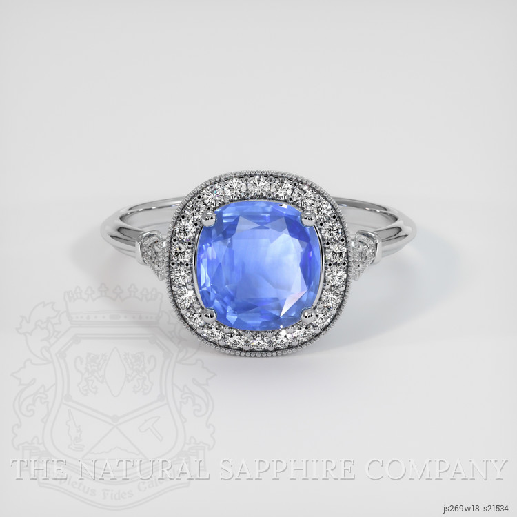 Introducing our exquisitely crafted ring by The Natural Sapphire Company, featuring a stunning 2.51 carat cushion-shaped blue sapphire that speaks volumes of elegance and refinement. This remarkable gemstone, originating from the rich lands of Ceylon (Sri Lanka), is renowned for its quality and beauty. Its transparent nature is complemented by a mixed brilliant cut, providing a dazzling sparkle echoed in its dimensions of 8.31 x 8.20 x 4.04 mm. With a clarity grade of eye clean and medium intense color saturation, the sapphire is further enhanced by heat treatment, which amplifies its natural allure.