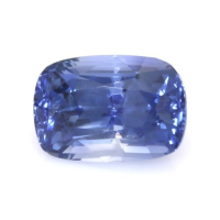 The ring features a beautiful, transparent 3.00 carat cushion shape blue sapphire with the dimensions of 9.13 x 6.39 x 5.75 mm and a mixed brilliant cut. It has a clarity grade of very slightly included (evaluated at eye level), medium color saturation, and an excellent polish. The origin of this sapphire is Ceylon (Sri Lanka).