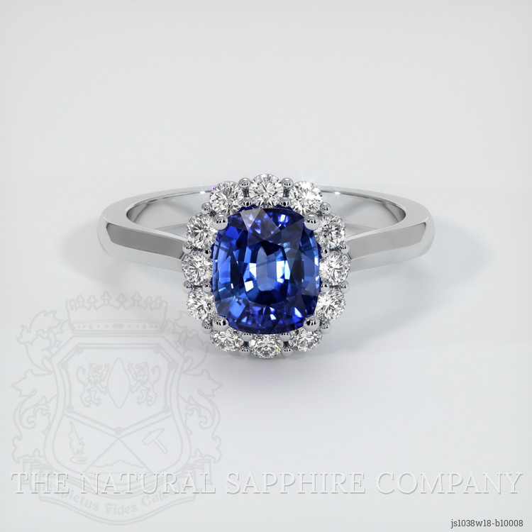 The ring features a beautiful, transparent 3.66 carat cushion shape blue sapphire with the dimensions of 8.89 x 7.49 x 5.84 mm and a mixed brilliant cut. It has a clarity grade of eye clean (evaluated at eye level), vivid color saturation, and an excellent polish. The origin of this sapphire is Ceylon.