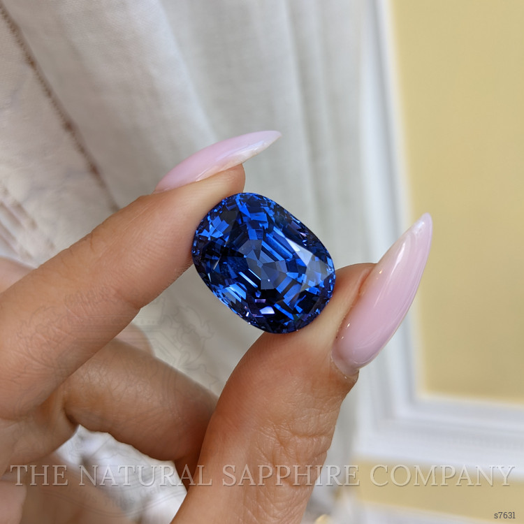 The men's ring features a beautiful, transparent AGL certified Blue 31.13 carat cushion shape blue sapphire with the dimensions of 19.37 x 14.49 x 12.02 mm and a mixed brilliant cut. It has a clarity grade of eye clean (evaluated at eye level), vivid color saturation, and an excellent polish. The origin of this sapphire is Madagascar.