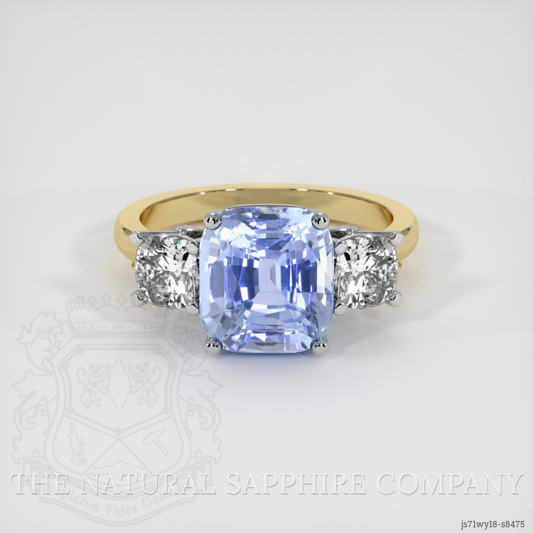 The ring features a beautiful, transparent C.Dunaigre certified Blue 4.01 carat cushion shape blue sapphire with the dimensions of 8.76 x 8.08 x 5.89 mm and a mixed brilliant cut. It has a clarity grade of eye clean (evaluated at eye level), medium light color saturation, and an excellent polish. The origin of this sapphire is Ceylon (Sri Lanka).