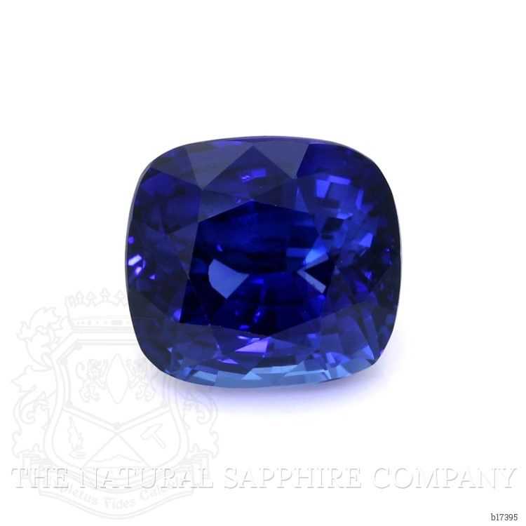 The ring features a beautiful, transparent GRS certified Blue 4.03 carat cushion shape blue sapphire with the dimensions of 8.56 x 7.80 x 6.41 mm and a mixed brilliant cut. It has a clarity grade of very slightly included (evaluated at eye level), vivid color saturation, and an excellent polish. The origin of this sapphire is Madagascar.
