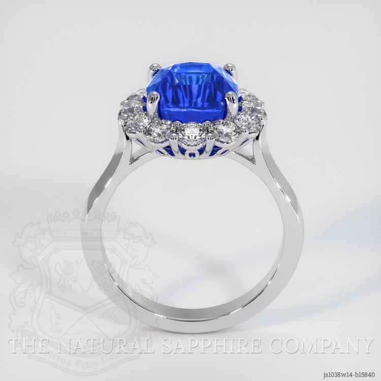 The ring features a beautiful, transparent 4.05 carat cushion shape blue sapphire with the dimensions of 7.82 x 7.76 x 7.35 mm and a mixed brilliant cut. It has a clarity grade of eye clean (evaluated at eye level), intense color saturation, and an excellent polish. The origin of this sapphire is Ceylon(Sri Lanka).