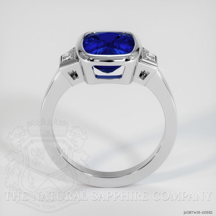The ring features a beautiful, transparent Other certified Vivid Blue “Royal Blue” 4.08 carat cushion shape blue sapphire with the dimensions of 10.00 x 8.36 x 5.27 mm and a mixed brilliant cut. It has a clarity grade of very slightly included (evaluated at eye level), vivid color saturation, and an excellent polish. The origin of this sapphire is Ceylon (Sri Lanka).