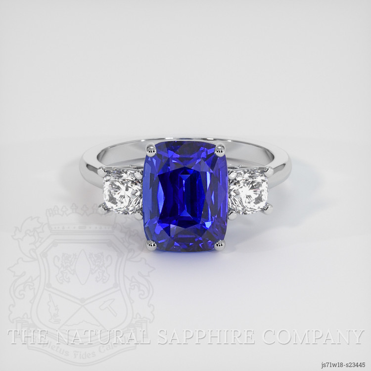 Complementing the sapphire are two pristine white cushion-shaped diamonds, meticulously selected to enhance the overall brilliance of the ring. The diamonds collectively weigh approximately 1.04 carats and possess a clarity grade that ranks within VS1 to VS2, ensuring a premium quality that allows only the slightest inclusions visible under magnification. Their color is rated as E, placing them within the range of near colorless and contributing to their remarkable luminosity. These diamonds serve to enhance the sapphire's vibrant hue, providing a harmonious balance of color and light that catches the eye from every angle.