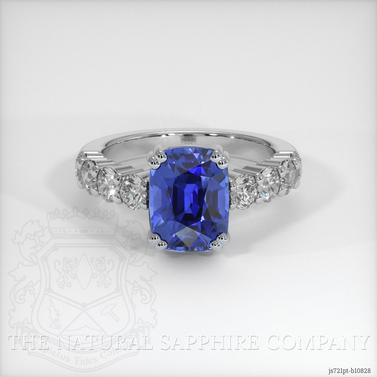 The ring features a beautiful, transparent 4.52 carat cushion shape blue sapphire with the dimensions of 10.14 x 7.77 x 6.28 mm and a mixed brilliant cut. It has a clarity grade of eye clean (evaluated at eye level), vivid color saturation, and an excellent polish. The origin of this sapphire is Ceylon (Sri Lanka).