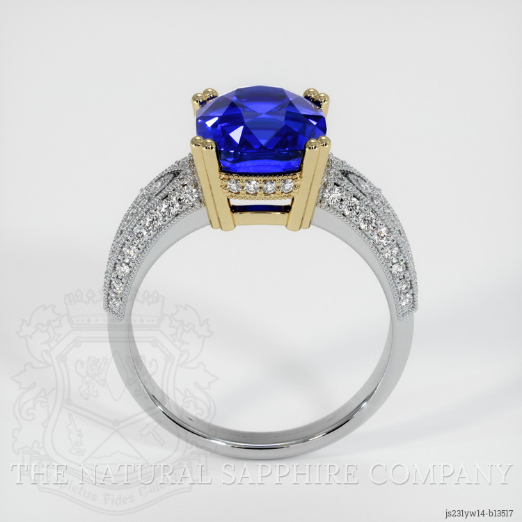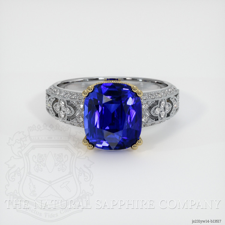 The ring features a beautiful, transparent C.Dunaigre certified Vivid Blue “Royal Blue” 5.03 carat cushion shape blue sapphire with the dimensions of 9.79 x 8.43 x 6.44 mm and a mixed brilliant cut. It has a clarity grade of eye clean (evaluated at eye level), vivid color saturation, and an excellent polish. The origin of this sapphire is Ceylon (Sri Lanka).
