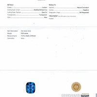 The ring features a beautiful, transparent GIA certified Blue 5.09 carat cushion shape blue sapphire with the dimensions of 10.77 x 8.70 x 6.00 mm and a mixed brilliant cut. It has a clarity grade of very slightly included (evaluated at eye level), vivid color saturation, and an excellent polish. The origin of this sapphire is Ceylon (Sri Lanka).