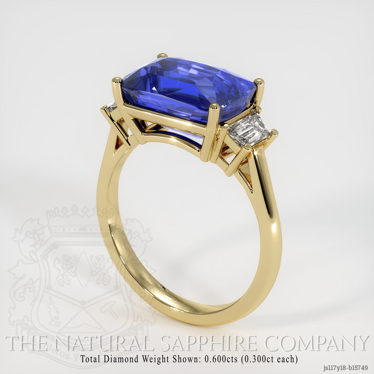 The ring features a beautiful, transparent 5.38 carat cushion shape blue sapphire with the dimensions of 10.99 x 7.31 x 6.45 mm and a mixed brilliant cut. It has a clarity grade of eye clean (evaluated at eye level), intense color saturation, and an excellent polish. The origin of this sapphire is Ceylon (Sri Lanka).
