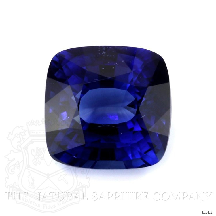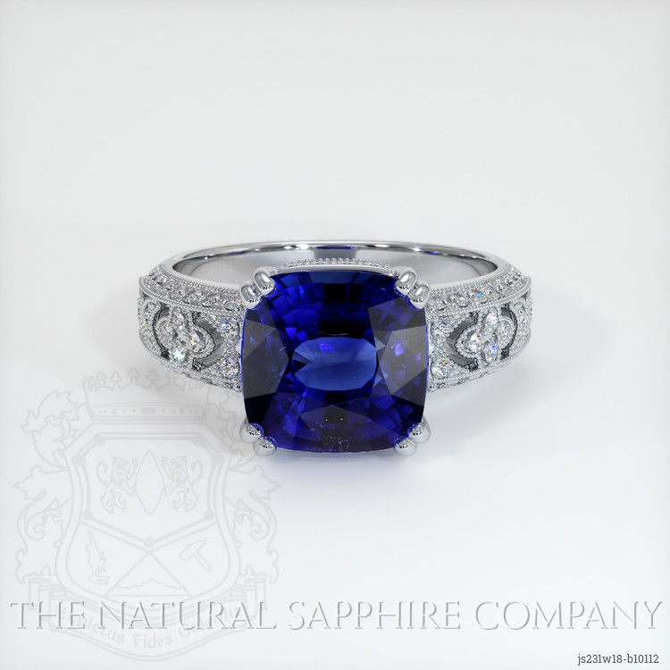 The ring features a beautiful, transparent C.Dunaigre certified Vivid Blue “Royal Blue” 5.63 carat cushion shape blue sapphire with the dimensions of 9.93 x 9.66 x 6.24 mm and a mixed brilliant cut. It has a clarity grade of very slightly included (evaluated at eye level), vivid color saturation, and an excellent polish. The origin of this sapphire is Ceylon (Sri Lanka).