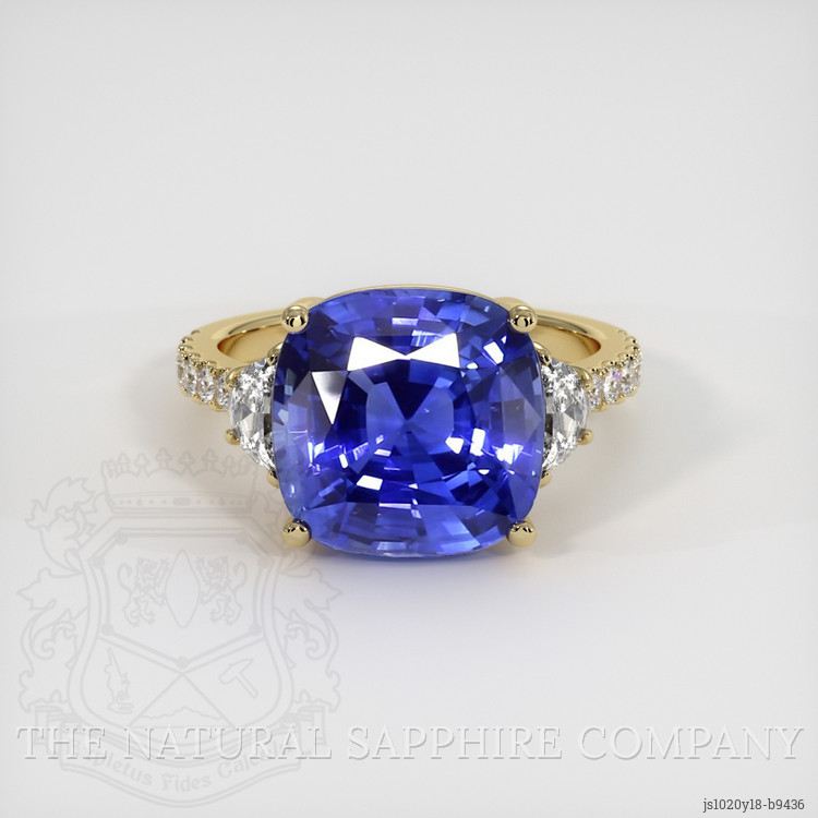 The ring features a beautiful, transparent C.Dunaigre certified Blue 7.24 carat cushion shape blue sapphire with the dimensions of 11.52 x 11.22 x 6.61 mm and a mixed brilliant cut. It has a clarity grade of very slightly included (evaluated at eye level), vivid color saturation, and an excellent polish. The origin of this sapphire is Ceylon (Sri Lanka).
