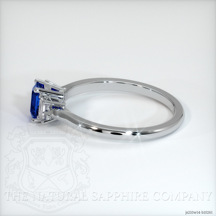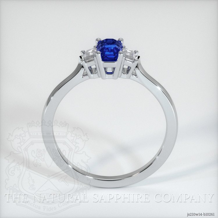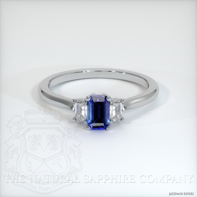 The ring features a beautiful, transparent 0.89 carat emerald cut shape blue sapphire with the dimensions of 6.26 x 4.17 x 3.49 mm and a emerald cut. It has a clarity grade of very slightly included (evaluated at eye level), vivid color saturation, and an excellent polish. The origin of this sapphire is Ceylon (Sri Lanka).