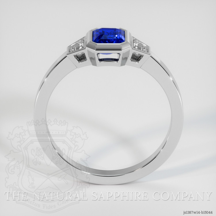 The ring features a beautiful, transparent 1.01 carat emerald cut shape blue sapphire with the dimensions of 6.05 x 5.04 x 3.17 mm and a emerald cut. It has a clarity grade of eye clean (evaluated at eye level), vivid color saturation, and an excellent polish. The origin of this sapphire is Ceylon (Sri Lanka).